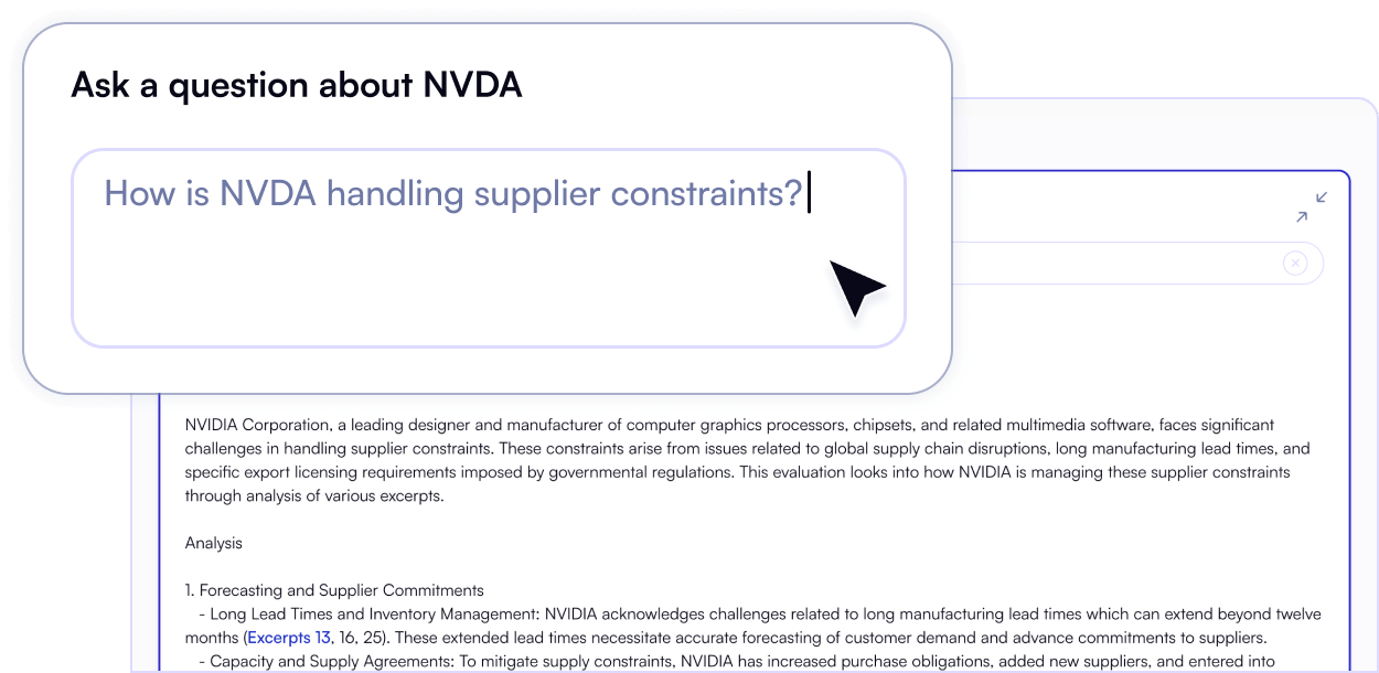 Go deep and get your questions about any company answered. Our AI searches for relevant terms and concepts, with links to sources conveniently provided for follow-up and validation.