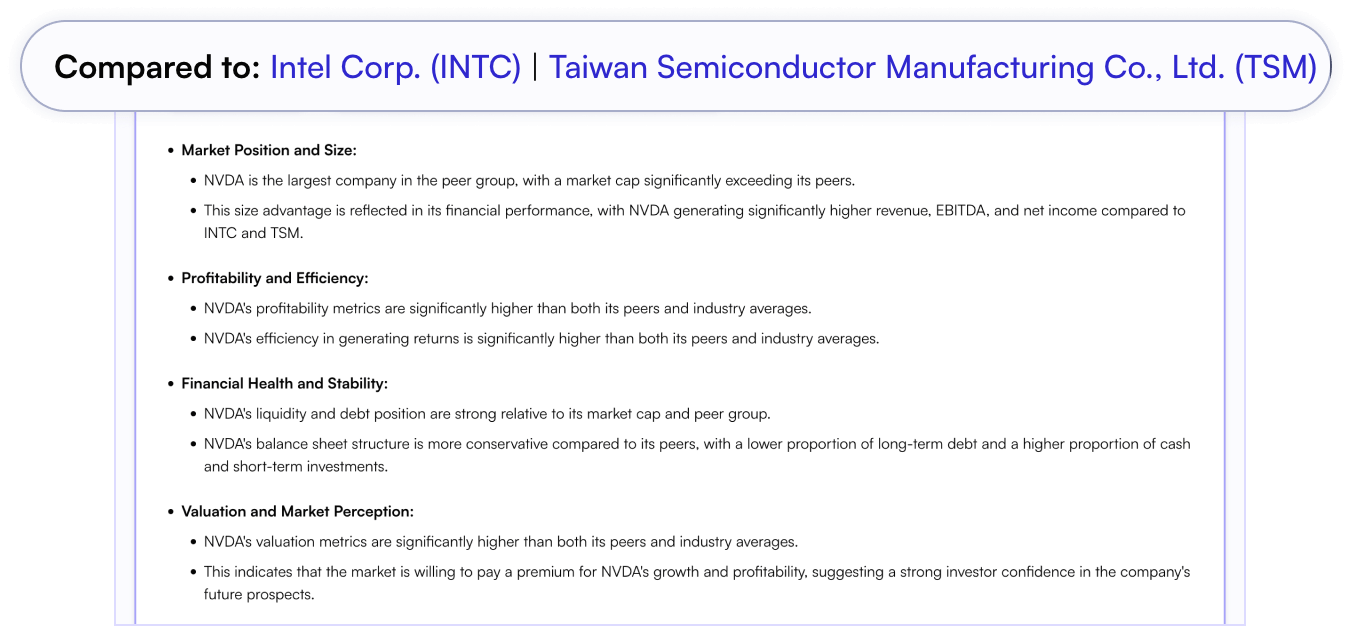 Al-enabled company analysis relative to industry comps, based off of company documents, filings, news, earnings report calls, financial statements, and stock performance.