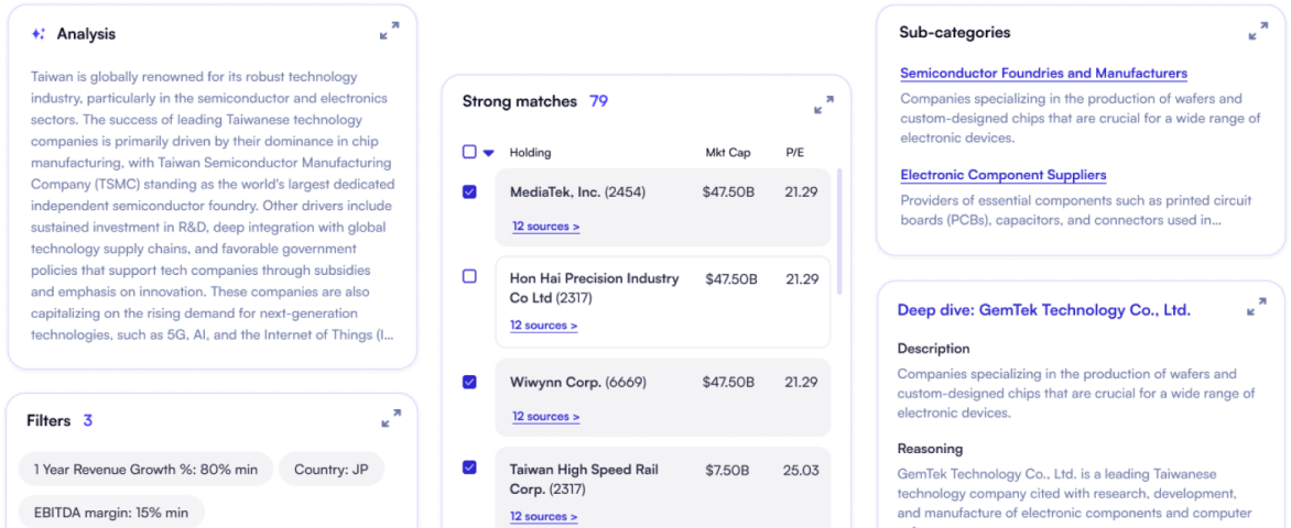 By combining generative AI, hundreds of thousands of company documents, and years of financial data, Thematic helps investment professionals quickly develop a point of view and draw conclusions.